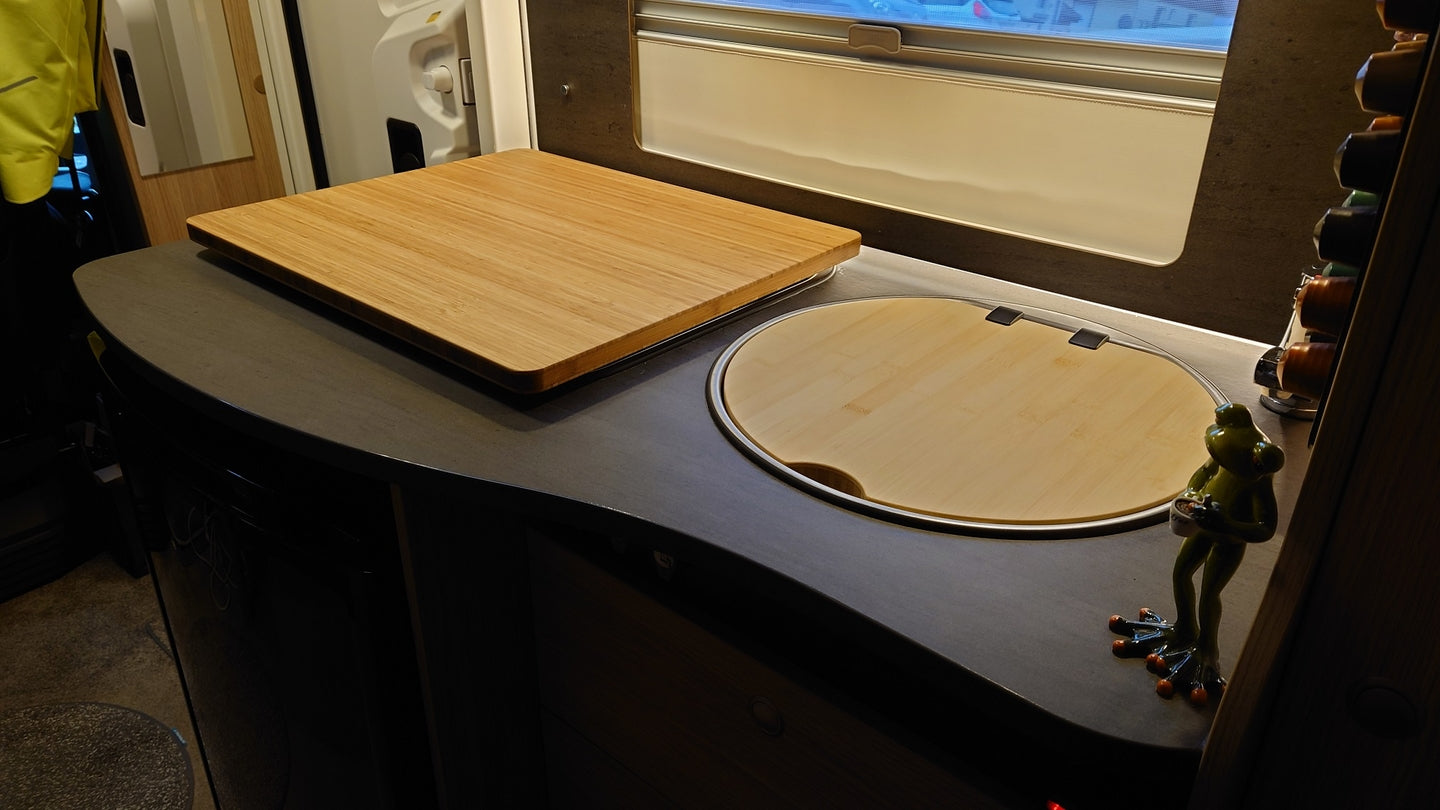 In het kleine keukentje van een camper neemt de spoelbak relatief veel ruimte in beslag.