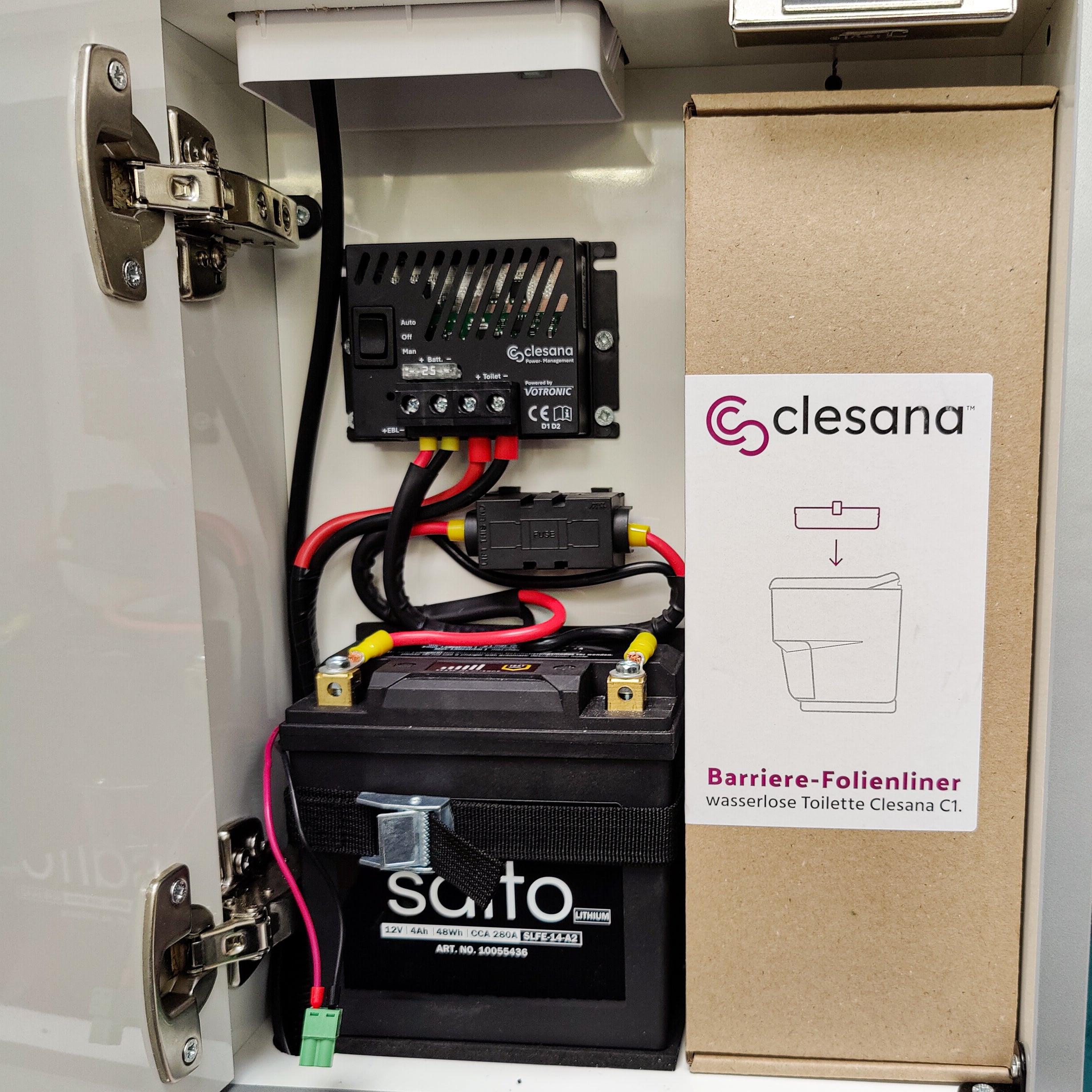 Het Clesana energiebeheersysteem combineert de functies van een relais en DC/DC-lader voor meer zelfvoorziening. Het is aangesloten op een reservebatterij die de stroomtoevoer vrijgeeft wanneer het toilet in gebruik is. Als de Clesana in stand-by staat, wordt de back-upbatterij opgeladen met 2A laadstroom via het energiebeheersysteem. Het wordt aangestuurd via een 12V continu plus kabel. Zelfs als de boordaccu uitvalt, kan de Clesana C1 nog steeds worden gebruikt via de back-upaccu. Het powermanagement kan door ons worden geïnstalleerd, inclusief alle aansluitingen, en we hebben onze timmerman Thorsten hiervoor laten opleiden en kwalificeren.