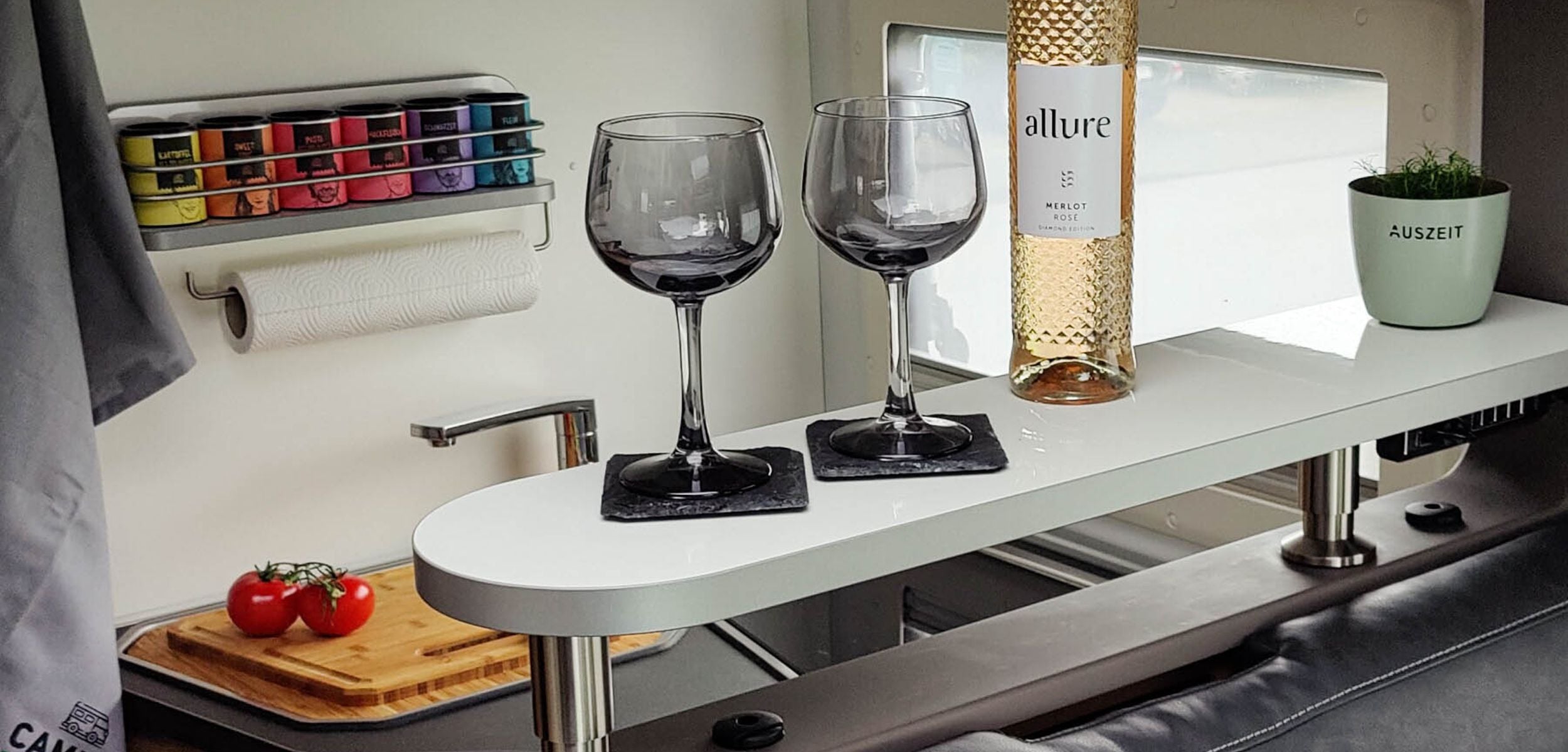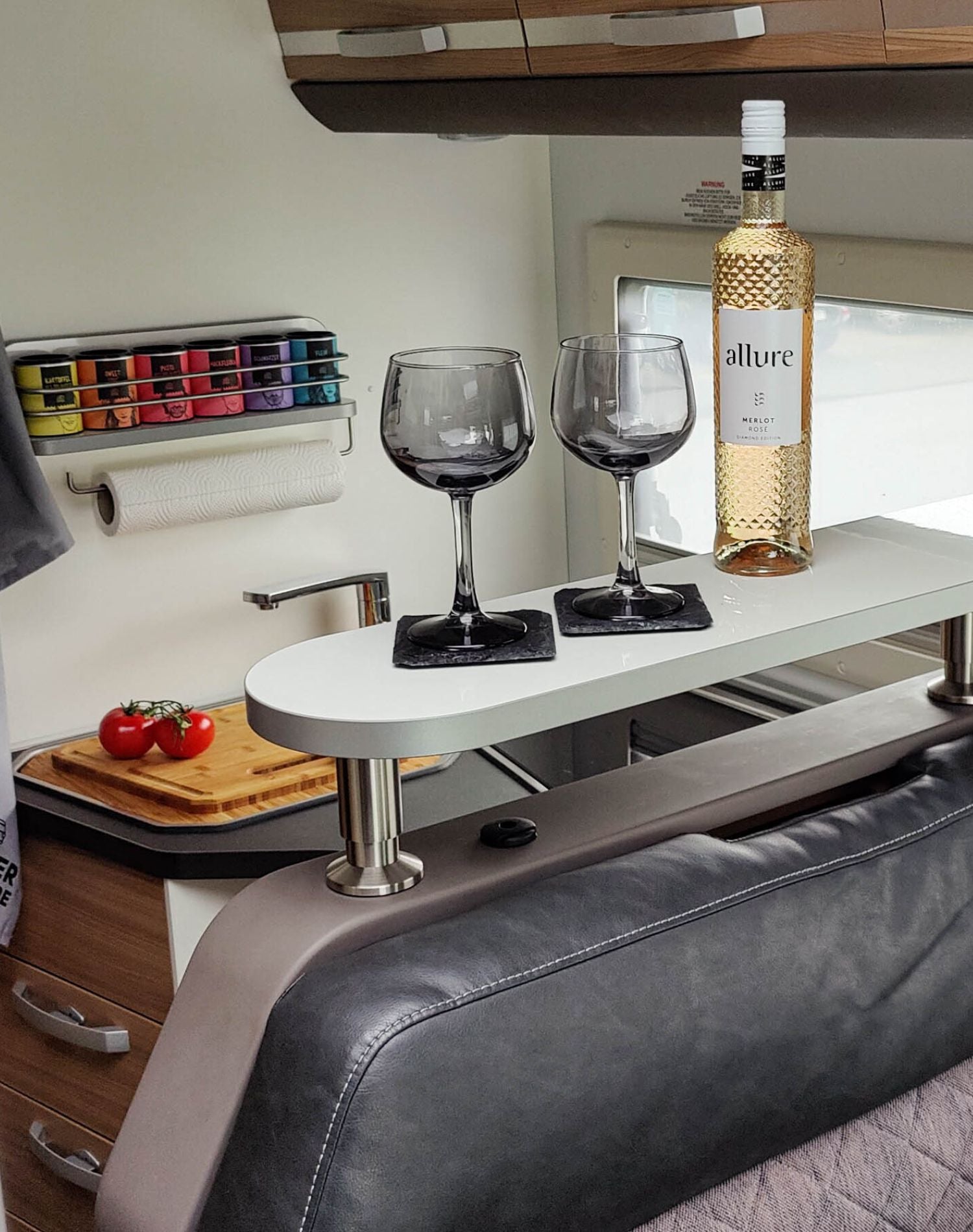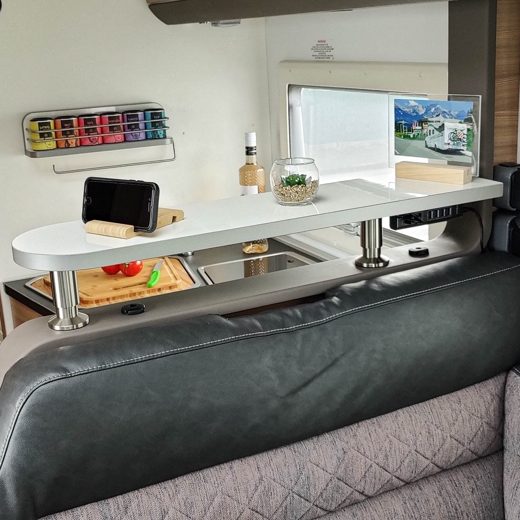 Dankzij het HPL-oppervlak wordt het een robuuste blikvanger in je camper en biedt het opbergruimte voor koffiezetapparaat, glazen of decoratie.