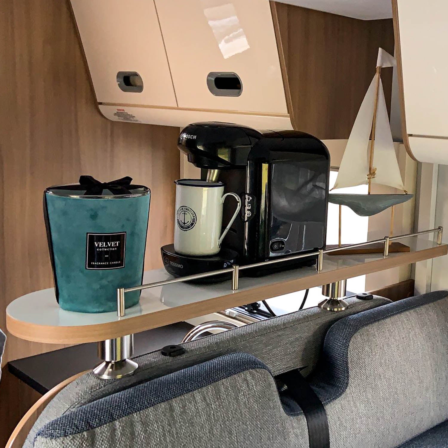 Onze opbergplank in plaats van hoofdsteunen in uw camper