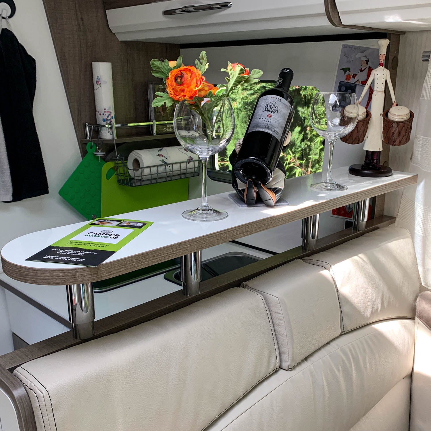 Onze opbergplank in plaats van hoofdsteunen in uw camper