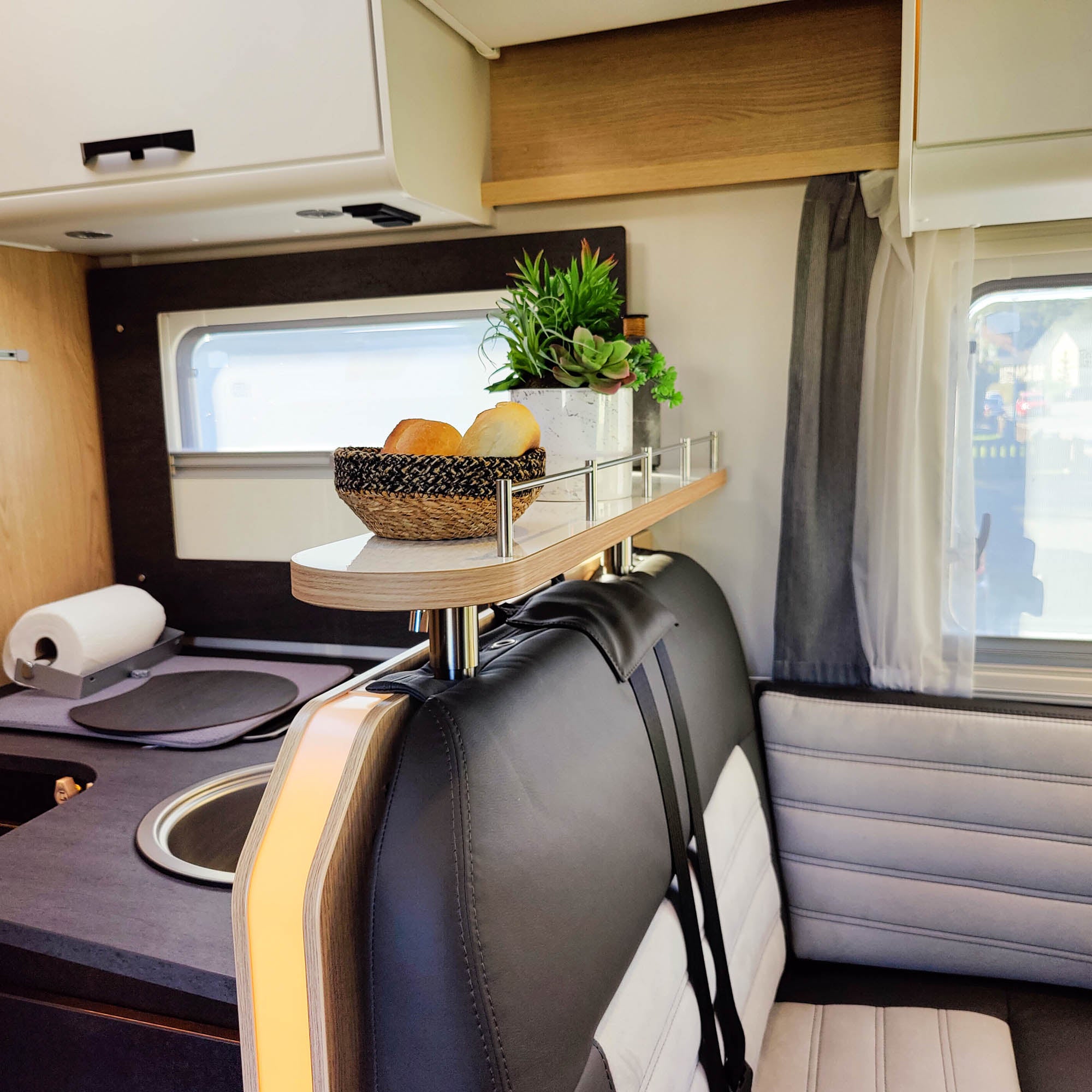 Onze opbergplank in plaats van hoofdsteunen in uw camper