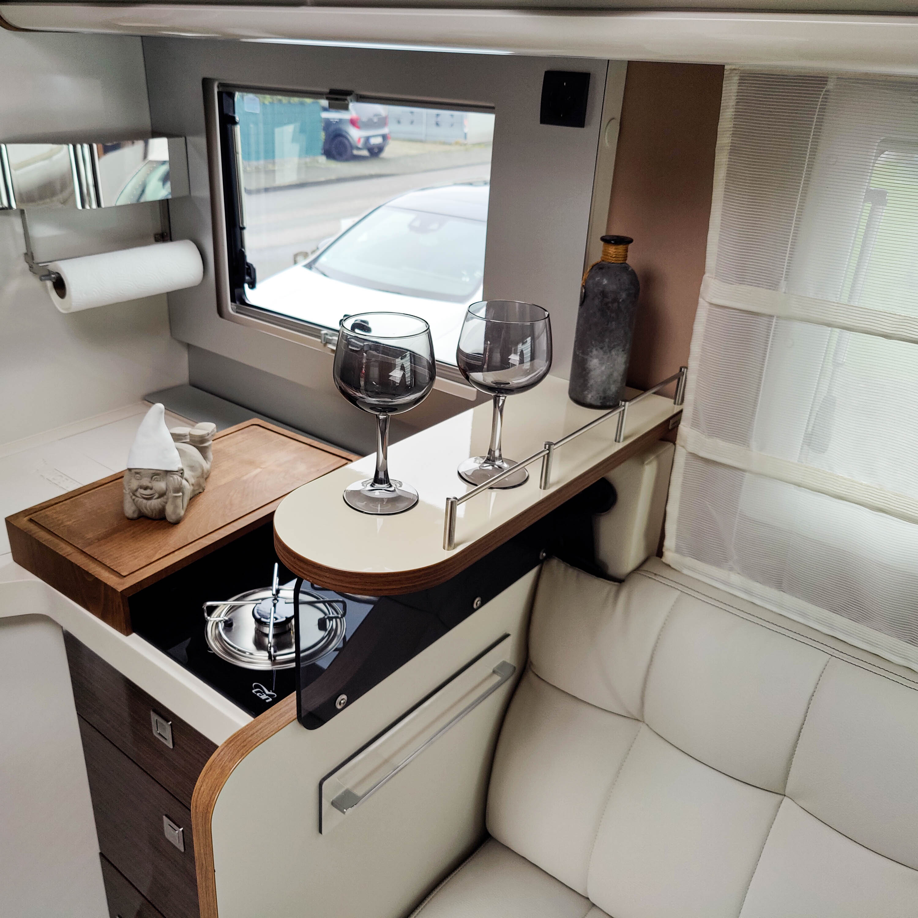 Mobilvetta Krosser en Kea plank met opbergvak bij het keukenraam en face to face