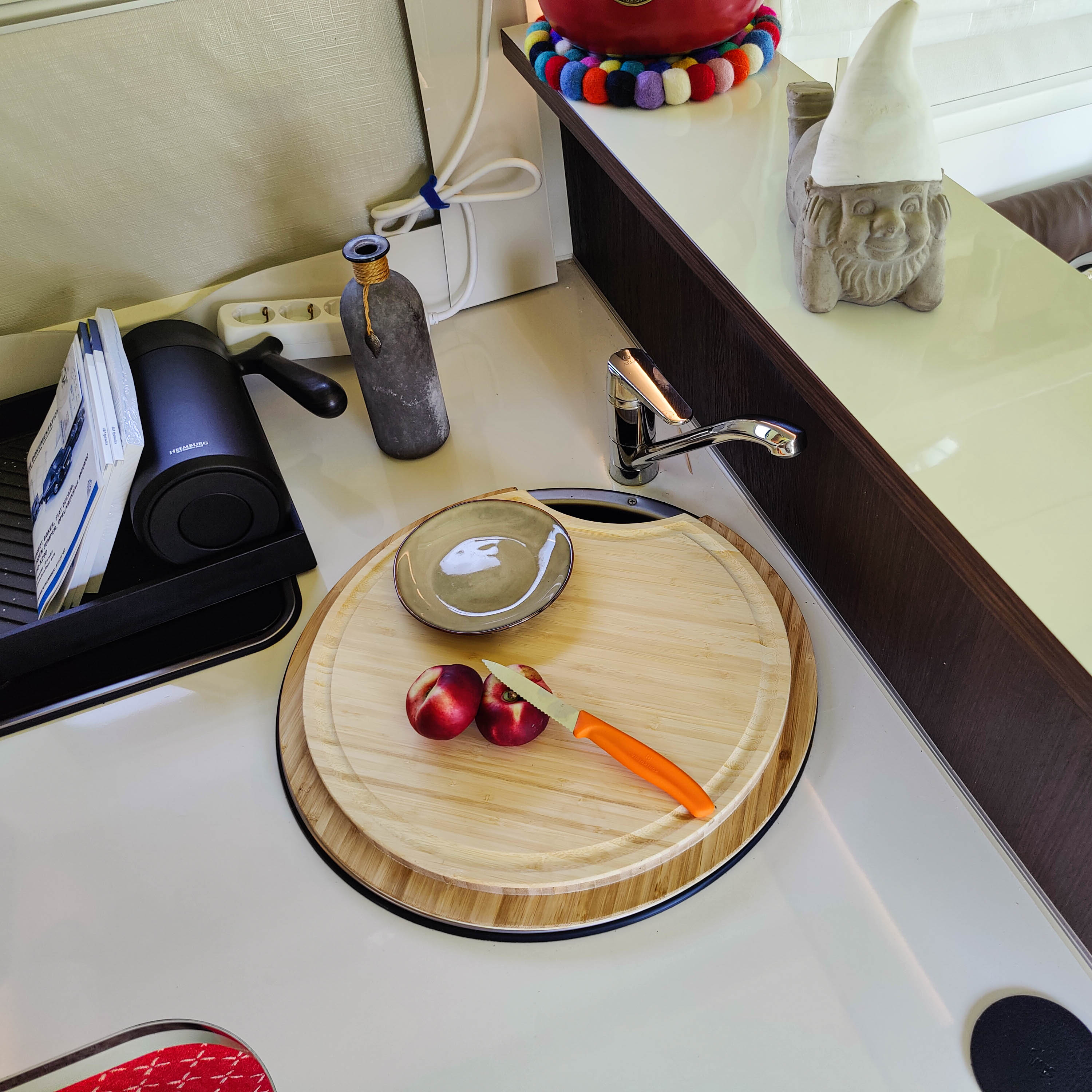 Onze bamboe snijplank voor het aanrecht in uw camper